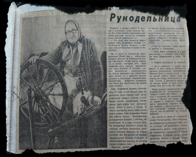 Хорошо была известна чалнинская ткачиха Ева Икконен. Ее изделия высоко оценили на Всесоюзной выставке в Москве, и заслуженная награда победителя ВДНХ была вручена уже ее дочери.
